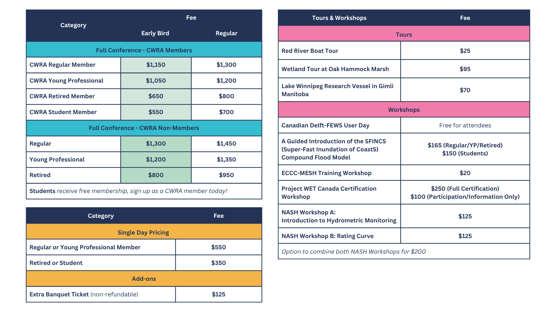 - One (1) banquet ticket is included in the CWRA Full Conference registrations.